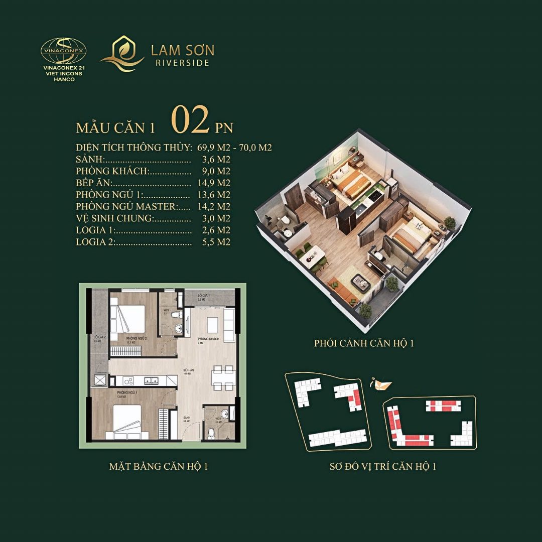Diện tích căn hộ: 34 – 77 m², thiết kế 1 – 3 phòng ngủ