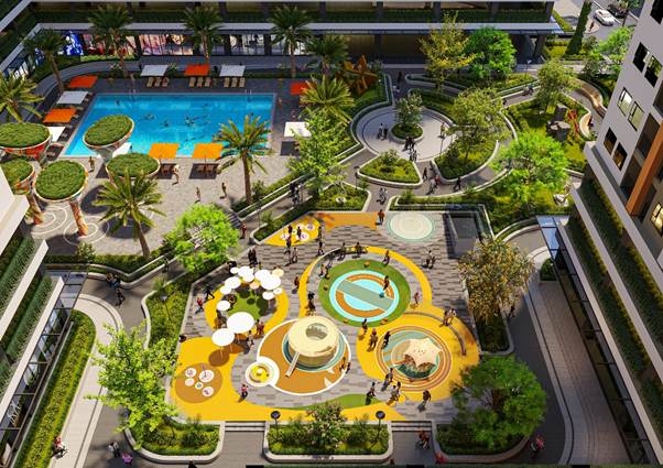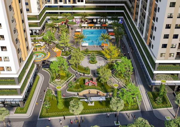 Tiện ích nội khu đầy đủ: sân thể thao, bể bơi, khu vui chơi, cây xanh.